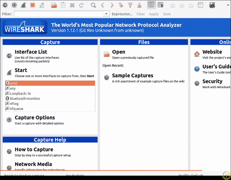安装并运行 Wireshark 后,您将看到一个窗口,类似于这样: