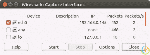 在对话框的右侧,您可以看到自打开窗口以来通过每个接口的数据包数量的实时计数。如果没有太多活动,您可以通过浏览网站来生成一些互联网流量。数据包计数上升最快的接口将是互联网接口(在 Linux 上忽略any接口)。记下接口的名称并关闭窗口。