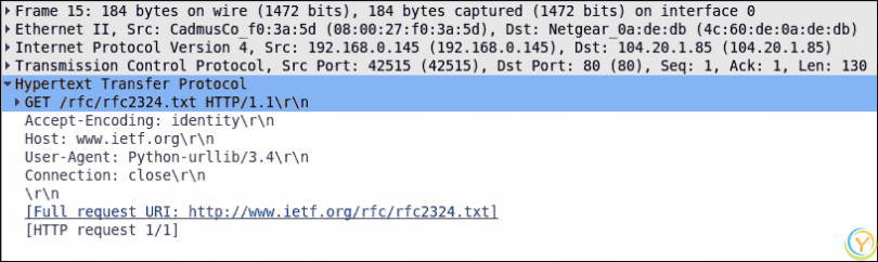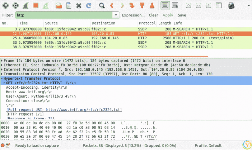即使在捕获会话期间您故意生成的唯一 HTTP 流量是通过下载程序,我们可能会看到更多的 HTTP 数据包。这是因为一些程序,例如文件云存储客户端,经常通过 HTTP 在后台与其服务进行通信。此外,Wireshark 目前将 SSDP 协议数据包识别为 HTTP,因为 SSDP 源自 HTTP。