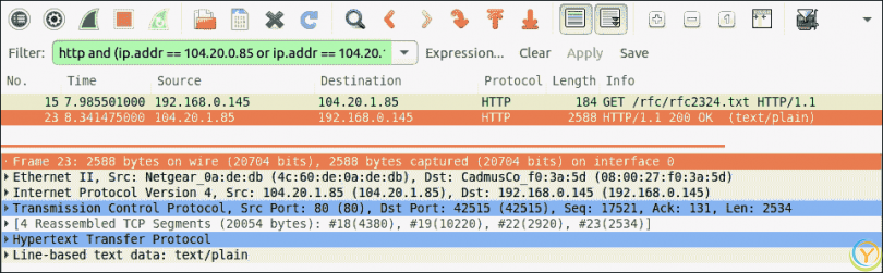 回到我们的 RFC 下载器数据包,如果表达式窗口打开了,让我们关闭它,然后将注意力转向主窗口。应用了http and (ip.addr == 104.20.1.85 or ip.addr == 104.20.0.85)过滤器后,我们应该在屏幕顶部的列表中看到两个数据包: